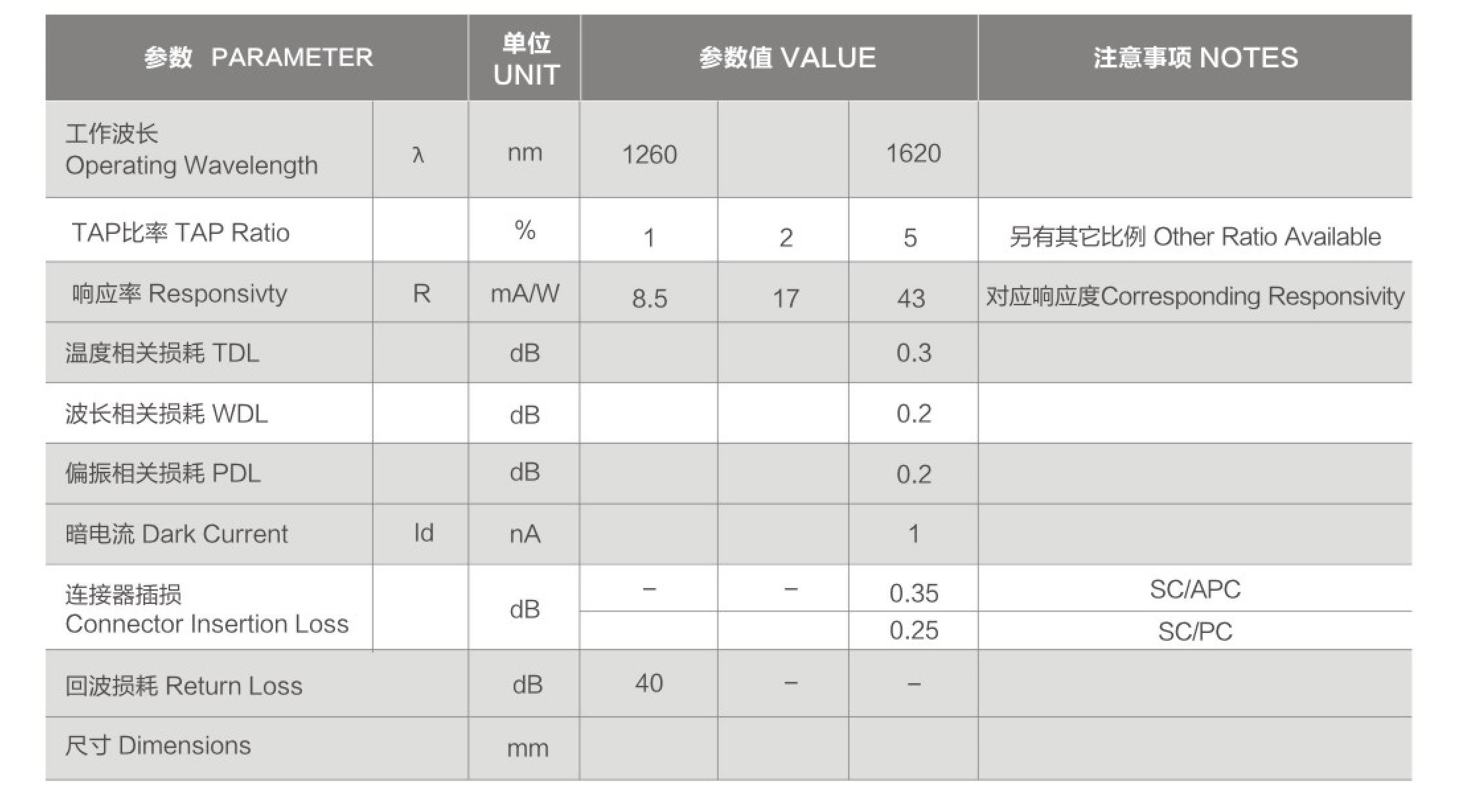 雙芯尾纖式結(jié)構(gòu),實(shí)現(xiàn)一定比例的光透射到探測(cè)器,其余的光反射到另一根光纖。用于WDM網(wǎng)絡(luò)監(jiān)控、光纖放大器、光開(kāi)關(guān)等。