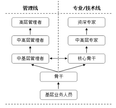 專(zhuān)業(yè)(技術(shù))線:指在某一個(gè)或幾個(gè)相關(guān)的領(lǐng)域內(nèi),持續(xù)深入的發(fā)展,追求專(zhuān)業(yè)技能的提升,以成為該領(lǐng)域內(nèi)的專(zhuān)業(yè)權(quán)威為目標(biāo)。